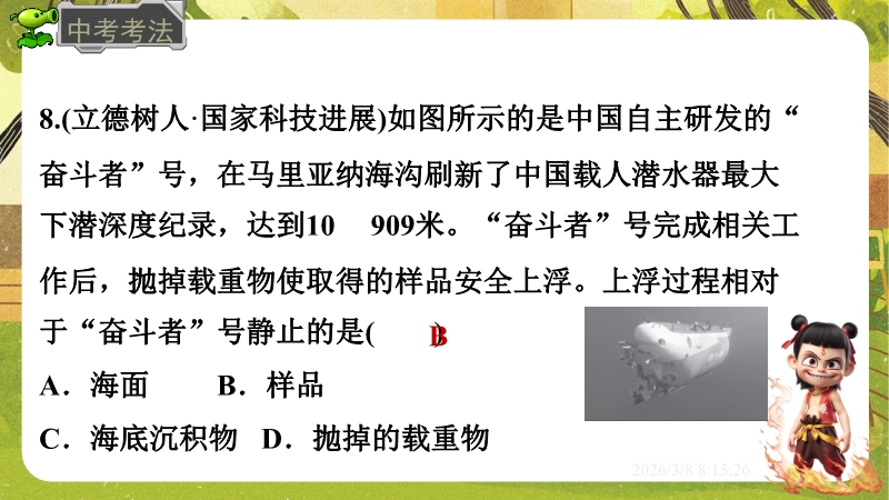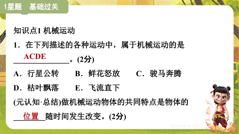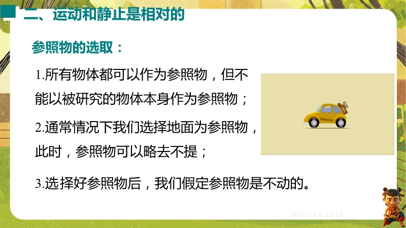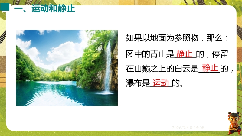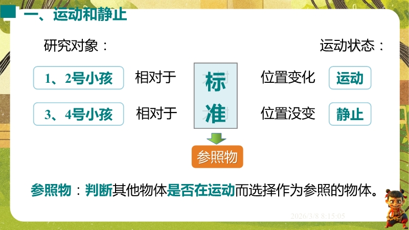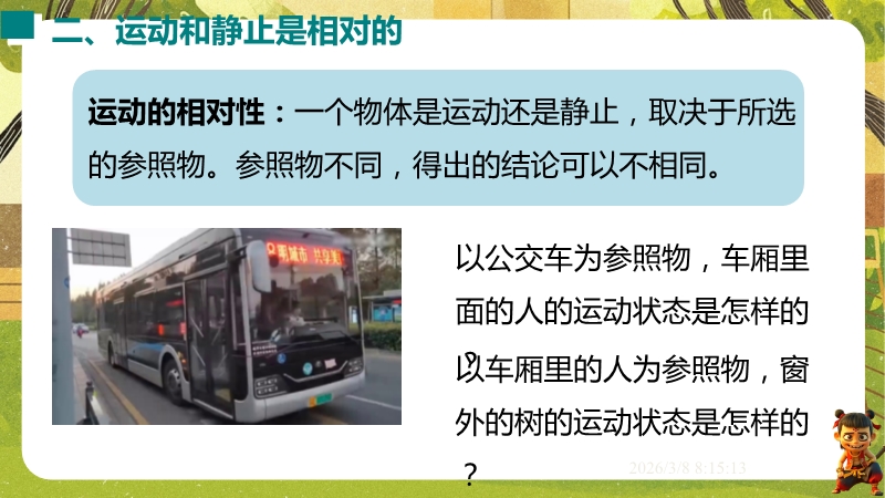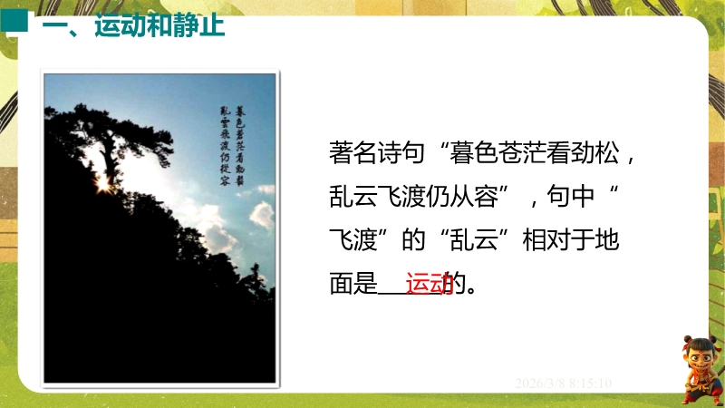 【内容简介】课件聚焦“运动的描述”,涵盖机械运动定义、参照物选择及运动静止相对性等核心知识点。通过孩子游戏活动、诗句情境等导入,引导学生从具体现象到抽象概念,构建“实例感知-定义理解-应用判断”的学习支架。其亮点在于融合科学思维与科学探究,以中考题、“奋斗者”号等新情境及“刻舟求剑”跨学科实例,培养学生模型建构与推理能力。采用活动探究与分层练习,课堂小结系统梳理知识,助力学生深化理解,也为教师提供丰富教学资源。