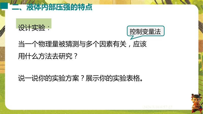 【内容简介】课件聚焦液体压强,涵盖特点、计算公式p=ρgh及连通器原理。以帕斯卡裂桶实验导入,通过模拟实验、U形管压强计探究等环节,构建从现象到规律的学习脉络,提供清晰学习支架。其亮点在于融合科学探究与科学思维,通过控制变量法、转换法设计实验,结合中考题及三峡船闸等实例,助学生深化物理观念。丰富习题与生活应用结合,既培养学生探究能力,又方便教师高效教学。