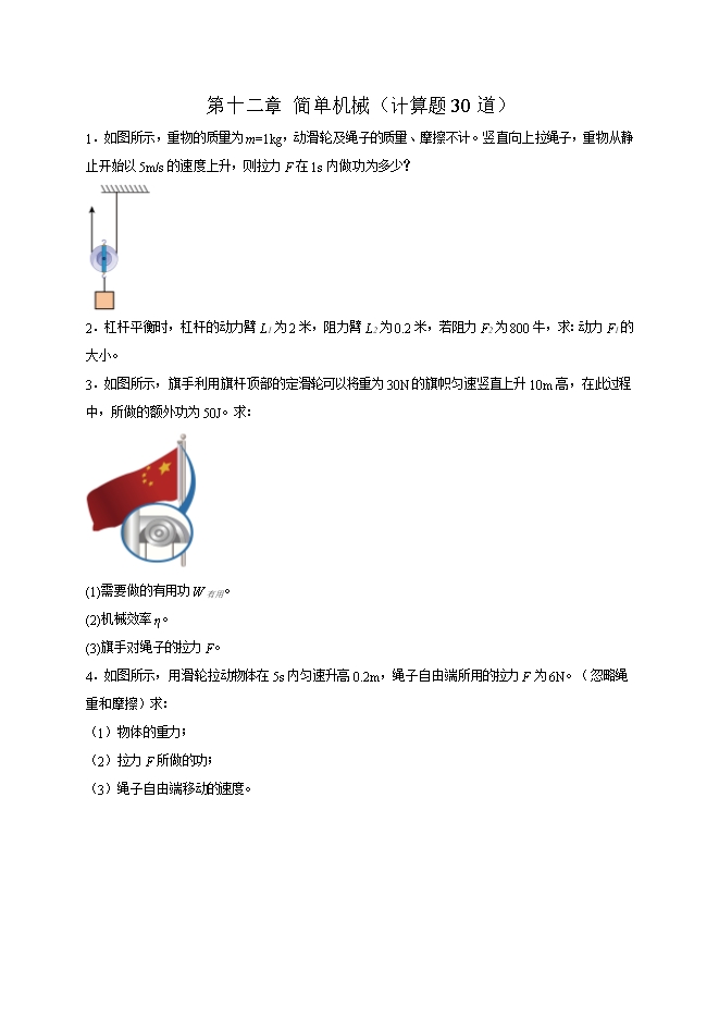 第十二章 简单机械(计算题30道)--2025-2026学年人教版八年级物理全册热点题型专练