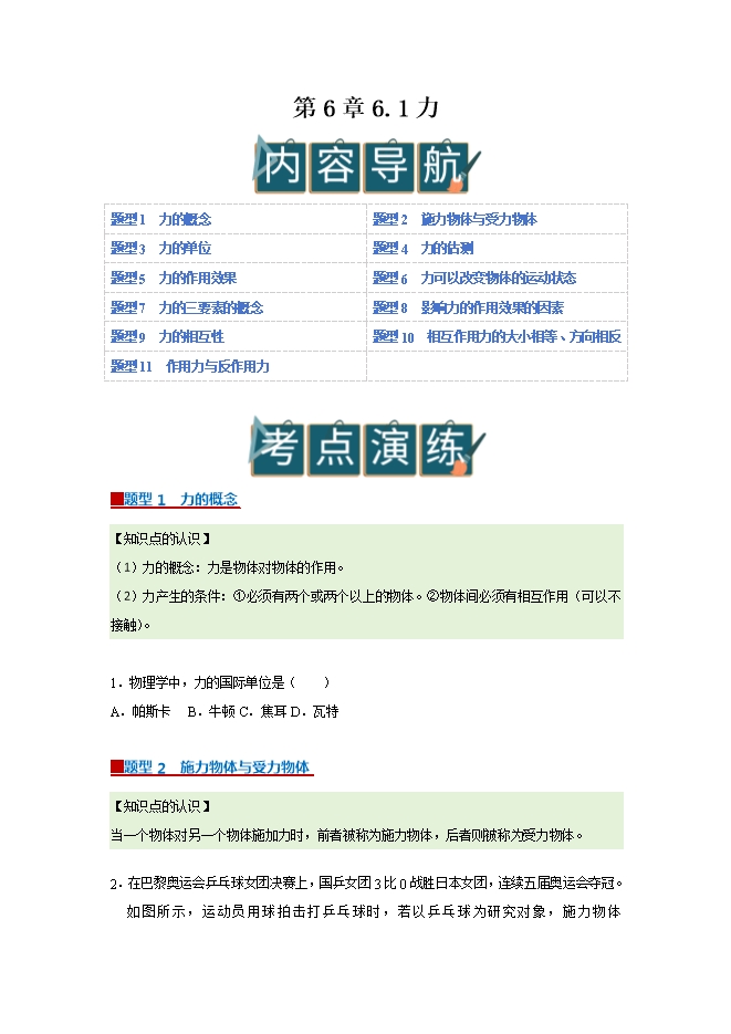 【内容简介】第6章 6.1 力--2025-2026学年沪粤版物理八年级下册同步考点演练