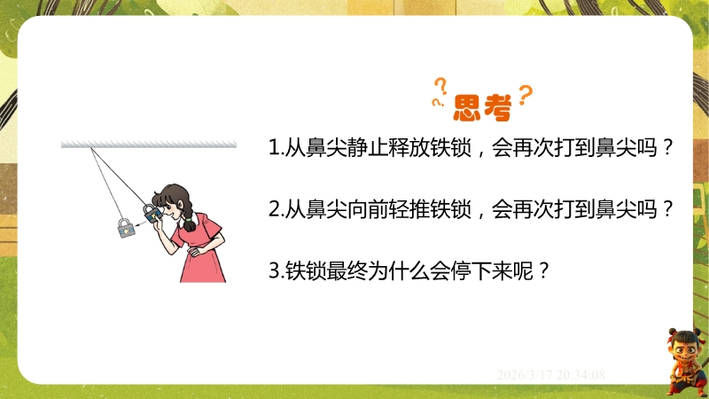 【内容简介】课件聚焦“机械能及其转化”,涵盖机械能概念、动能与势能转化及守恒条件。通过飞行中的飞机、跳水运动员等实例导入,结合滚摆实验、铁锁摆动等探究转化过程,以碗中小球等分析守恒条件,构建从概念到转化再到守恒的学习支架。其亮点在于以科学探究为核心,通过滚摆实验、弹簧小车等引导学生观察能量转化,结合卫星轨道、水碓工作原理等实例培养能量观念与科学态度。练习题及中考真题强化应用,助力学生深化理解,教师可直接用于教学提升效率。