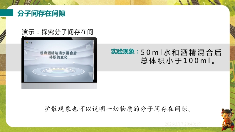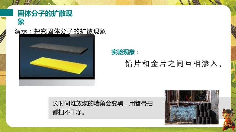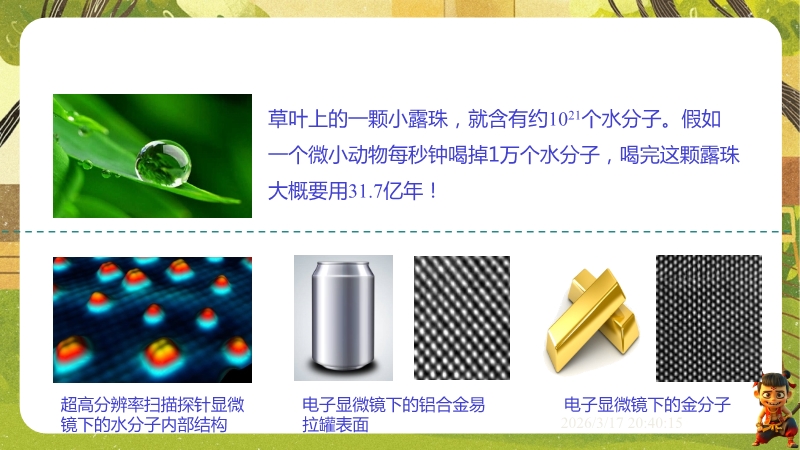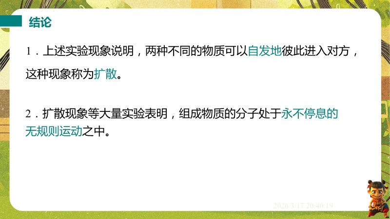 【内容简介】课件聚焦“物质结构的微观模型”,通过露珠含分子数量等生活实例导入,结合气体、液体、固体扩散实验,引导学生从宏观现象到微观本质,构建“物质由分子组成、分子运动与温度相关、分子间存在间隙和作用力”的知识脉络,形成学习支架。其亮点在于以实验探究为核心,通过二氧化氮扩散、铅块结合等演示及固液气特征对比表,落实科学探究与模型建构。结合“菊香满园”等生活实例题,强化物理观念,帮助学生用物理学视角解释现象,提升科学思维,同时为教师提供清晰教学逻辑与丰富素材,提高教学效率。