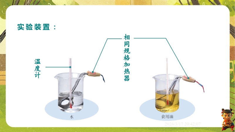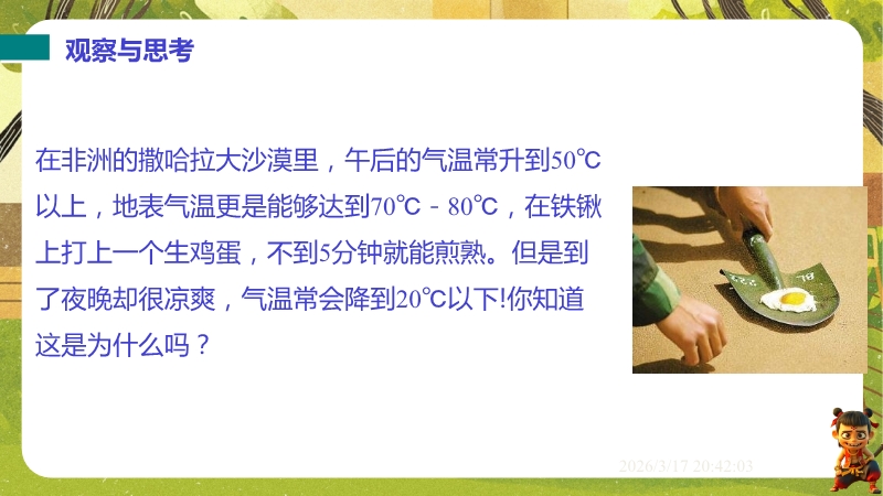 【内容简介】课件聚焦“比热容”核心知识点,通过撒哈拉沙漠昼夜温差的“观察与思考”导入,以“比较不同物质吸热情况”的问题链引出影响因素,经猜想、实验设计(控制变量法、转换法)构建知识支架,帮助学生理解物质吸热能力差异及导热性概念。其亮点在于以科学探究为主线,通过两种实验方案培养科学思维,结合比热容表和生活实例(暖气片、炒菜锅手柄)深化物理观念。融入中考考点及练习题,助力学生巩固知识,教师可直接用于课堂教学,提升教学效率。