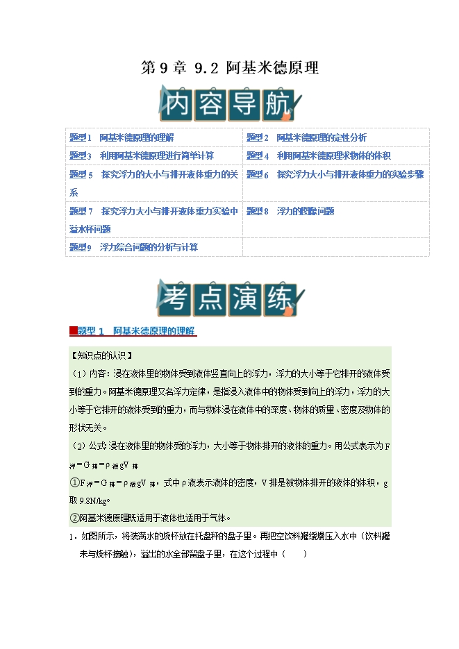 【内容简介】第9章 9.2 阿基米德原理--2025-2026学年沪粤版物理八年级下册同步考点演练
