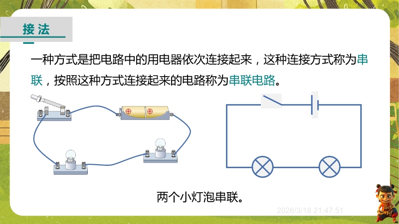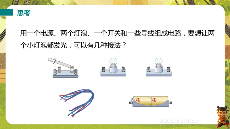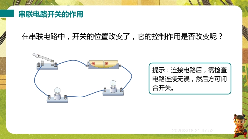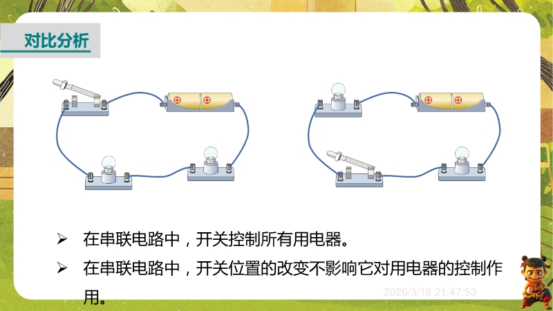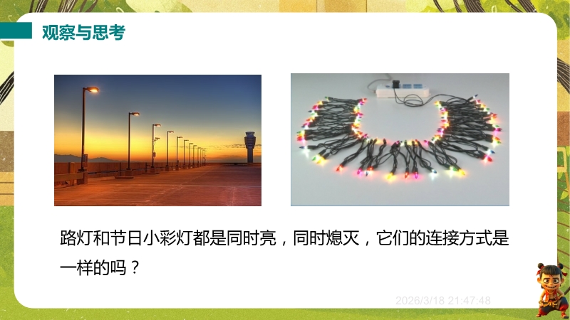 【内容简介】课件聚焦串联与并联电路的特点、开关作用及识别方法。通过“温故知新”回顾电路组成与元件符号,结合“路灯与小彩灯连接方式”的观察思考,以“设计两种电路接法”为支架,衔接旧知与新知,引导学生建构电路连接的物理观念。其亮点在于融合科学思维与科学探究,通过对比表格梳理串并联电路的连接特点、电流路径等(模型建构),设计“拆除法”“节点法”等识别方法(科学推理),结合高铁闸机、家庭电路等生活实例(社会责任)。例题与练习题从基础判断到电路设计,助力学生提升实验操作与问题解决能力,也为教师提供结构化教学资源,提高课堂效率。