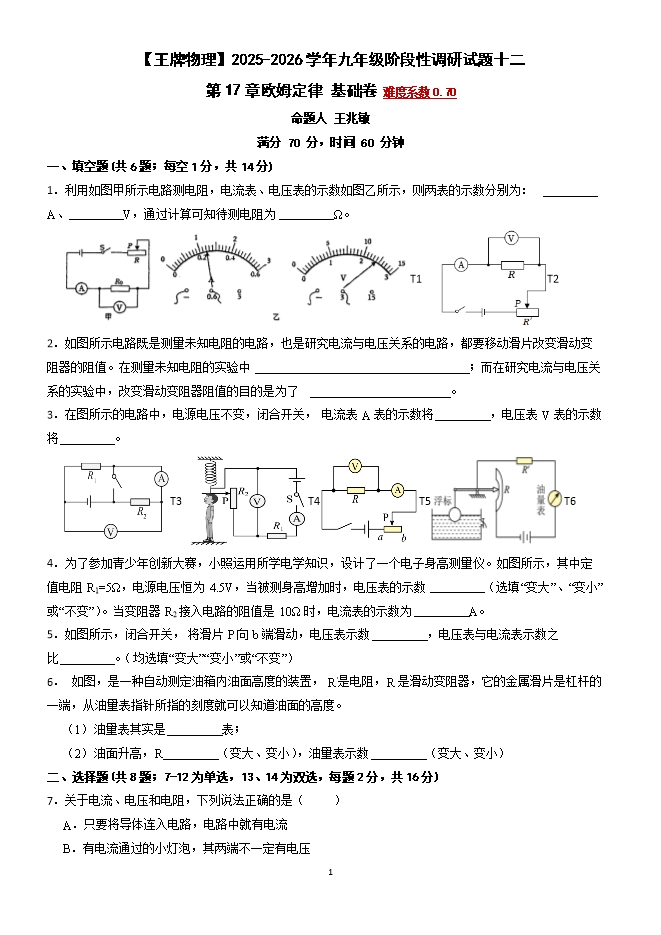 【内容简介】第17章 欧姆定律 专题训练--2025-2026学年九年级阶段性调研试题十二(人教版)【王牌物理河南专版】