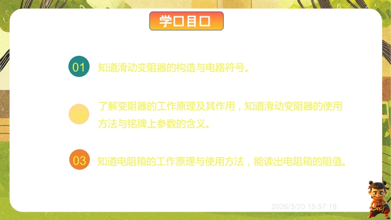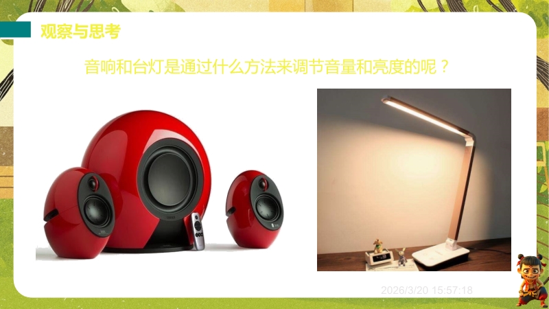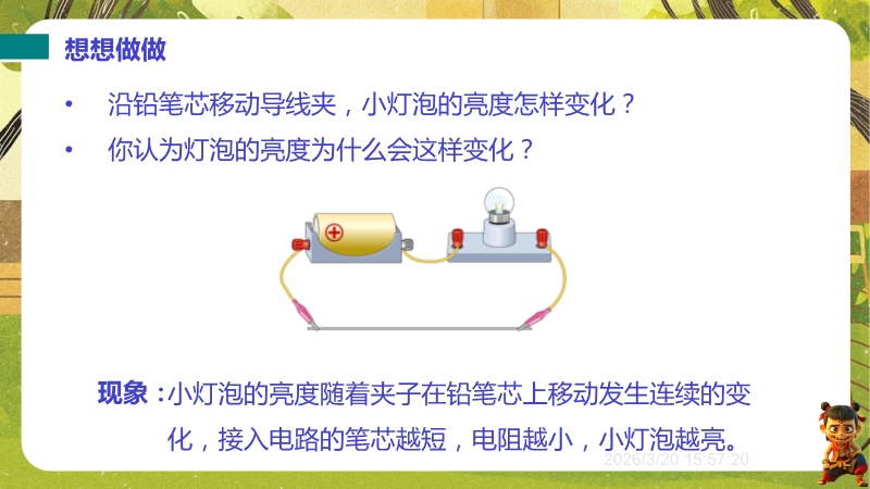 【内容简介】聚焦“变阻器”核心内容,涵盖滑动变阻器(构造、原理、接法、参数)与电阻箱(结构、读数)。通过“音响台灯调节”生活现象导入,结合“铅笔芯实验”探究灯泡亮度变化,引导学生从生活问题到实验现象,提炼“改变导体长度可改变电阻”原理,搭建从生活到物理的学习支架,衔接欧姆定律中电阻对电流的影响。课件亮点在于融合科学探究与科学思维:“想想做做”实验、动画及视频演示滑动变阻器使用,让学生亲历探究过程;练习题含故障分析(灯泡亮度不变原因)、实际应用(调光台灯电路连接),培养科学推理与问题解决能力。课堂小结系统梳理知识,助学生形成物理观念,丰富的多媒体资源与分层习题也为教师高效教学提供支持。