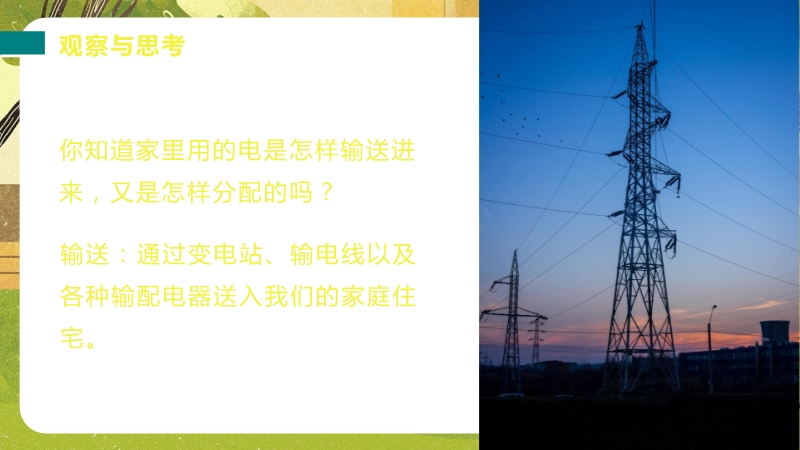 【内容简介】课件聚焦“家庭电路”核心知识,涵盖组成(进户线、电能表等)、电流过大原因及保险设备等内容。通过“观察与思考”导入,结合生活实际问题,衔接电路连接、电压等前序知识,搭建学习支架帮助学生构建知识体系。其亮点在于以生活实例为载体,通过“交流与思考”引导科学思维,结合保险设备作用分析培养科学论证能力,三孔插座安全用电知识渗透科学态度与责任。采用问题驱动和例题解析,课堂小结结构化呈现要点,助力学生掌握知识,也为教师提供丰富教学资源,提升教学效率。