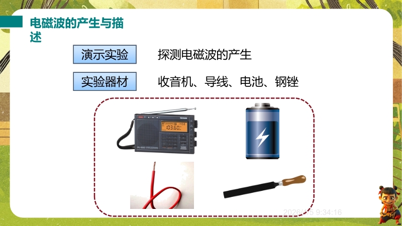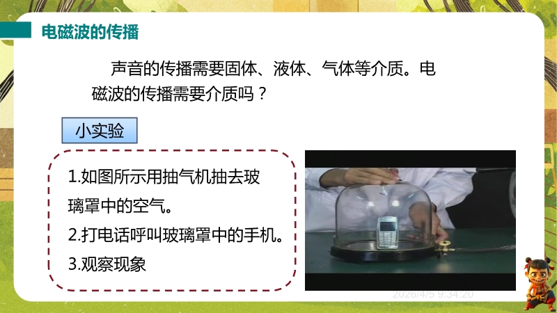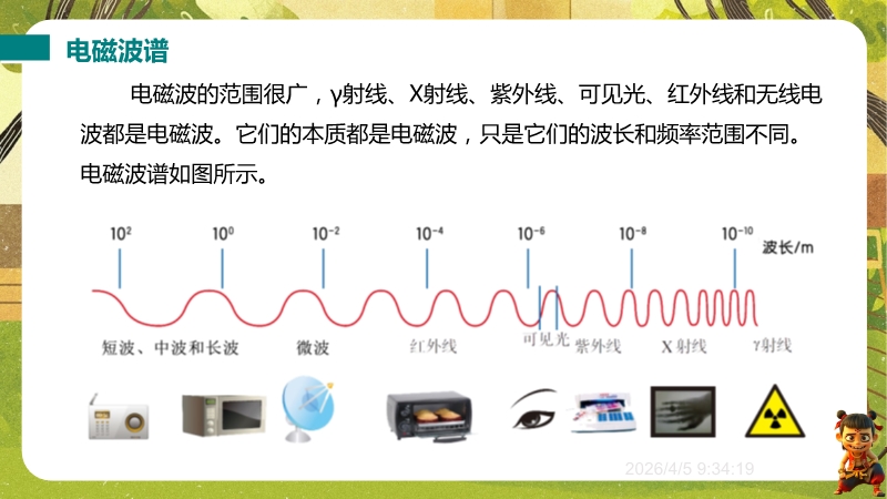 【内容简介】课件围绕电磁波的产生、特征(波长、频率、波速)及应用展开,通过遥控器选台、收音机信号等生活现象导入,结合“探测电磁波产生”演示实验,构建从生活到实验再到规律的学习支架。其亮点在于融合科学探究与物理观念,通过真空钟罩手机实验验证电磁波传播特性,结合电磁波谱图和波速公式培养科学思维,练习题含中考真题及跨学科实践。学生能提升探究能力,教师可高效利用结构化资源教学。