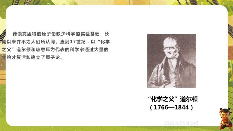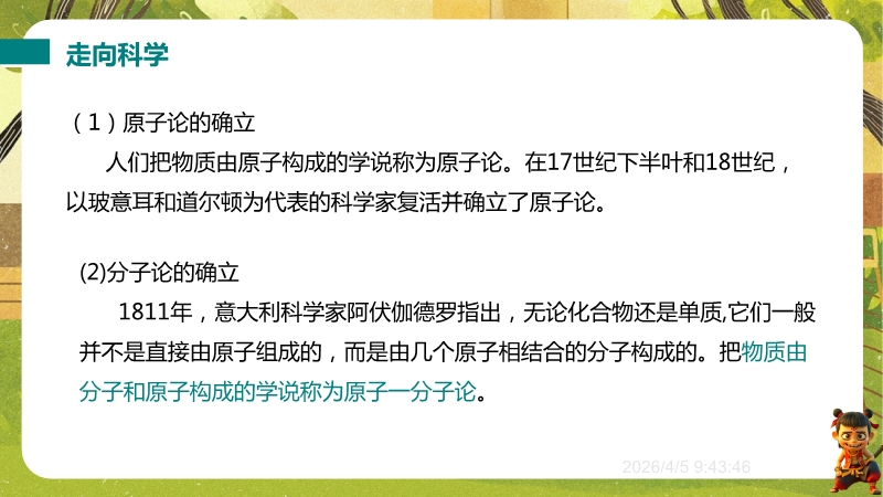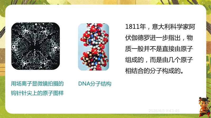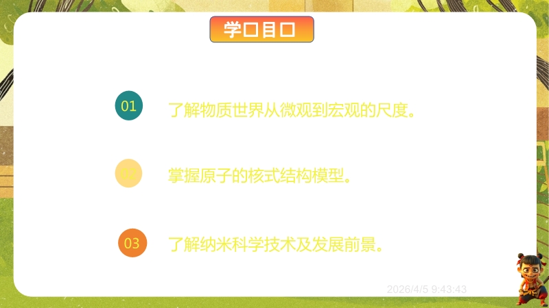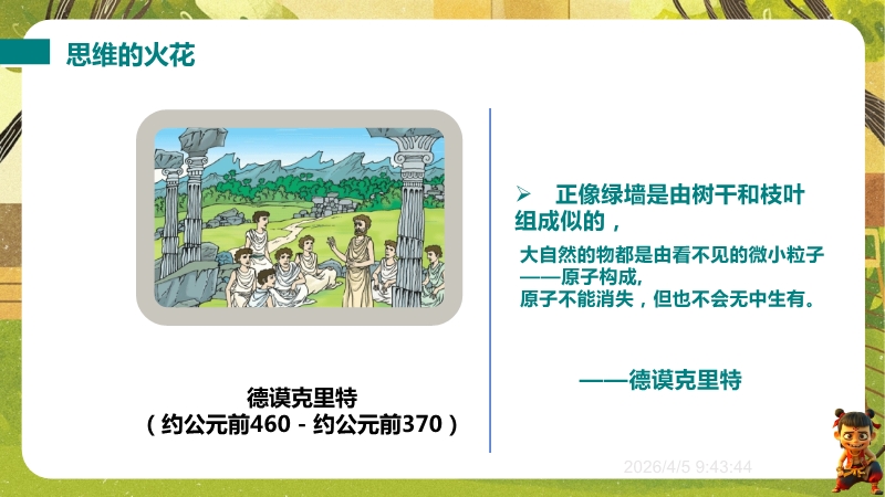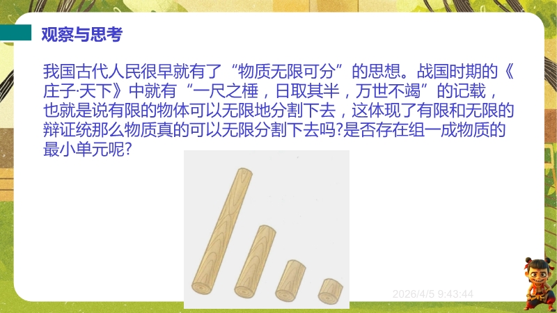【内容简介】课件围绕“探索微观世界的历程”,系统呈现物质微观尺度、原子核式结构模型及纳米科技等核心知识。以《庄子·天下》“一尺之棰”引发思考,从古代哲学思想到近代科学实验,构建从原子论到夸克模型的认知支架,帮助学生梳理微观探索脉络。其亮点在于融合科学史与实验探究,通过德谟克里特原子论、卢瑟福散射实验等案例,培养学生科学思维与科学探究能力。结合纳米科技应用实例,渗透物理观念与科学态度,既助学生建立微观认知体系,又为教师提供结构化教学资源,提升教学效率。