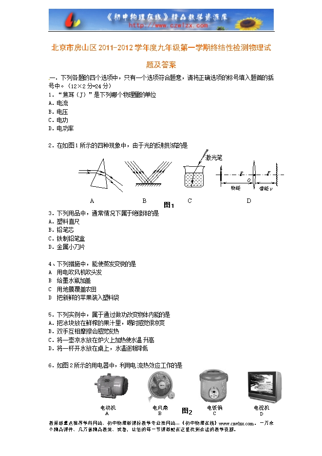 北京市房山区2011-2012学年第一学期期末检测八年级物理试题及答案