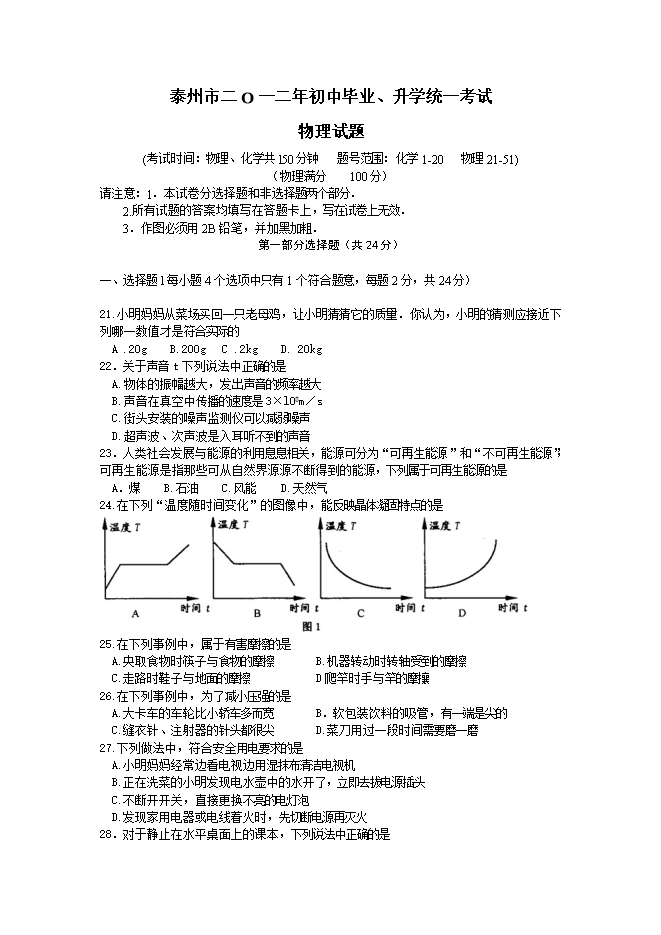 【内容简介】南京市2012年初中毕业生学业考试物理试题及答案(扫描版)