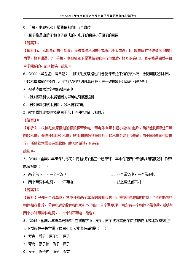8.在演示声音是由物体的振动发生的实验中,将正在发声的音叉紧靠悬线下的泡沫塑料球,球被多次弹开.在此实验中,泡沫塑料球的作用是 ( )