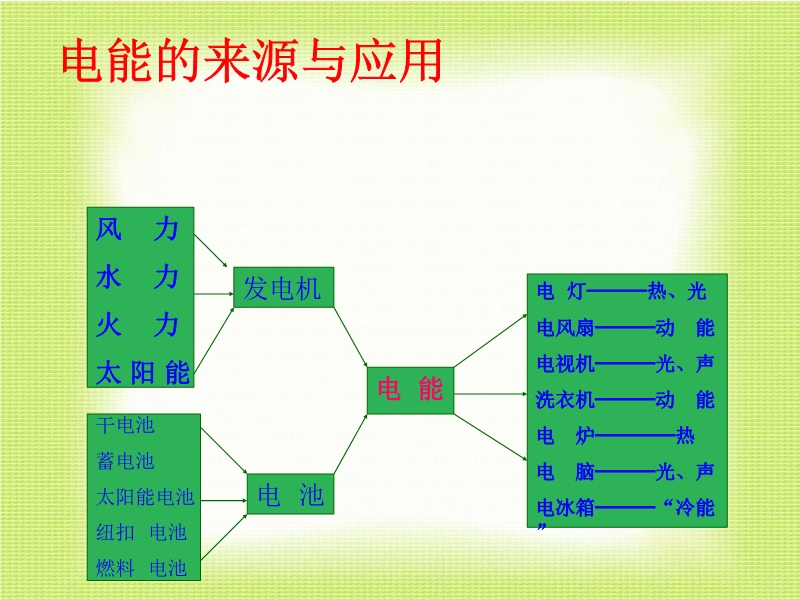 【例1】电流通过电风扇做功,使风扇转动,这是____能转化为____能;电流通过日光灯,日光灯发光,这是______能转化为______能;电流通过电暖气发热,这是____能转化为____能。
