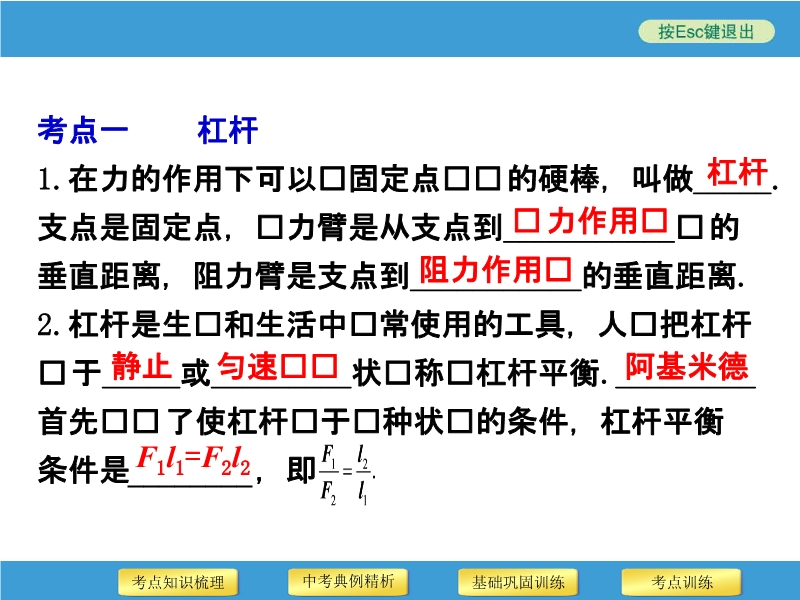 1.杠杆的平衡条件是指杠杆静止不动或匀速转动。