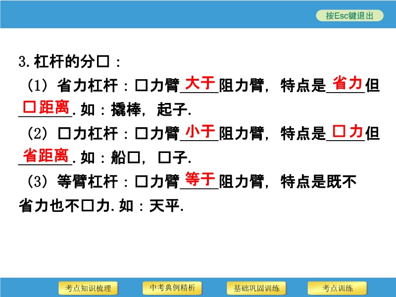 省力杠杆 L1> L2 F1 <F2 省力费距离 撬棒