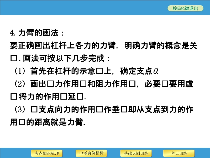 (1)支点:杠杆绕着固定转动的点,用字母“O”表示。