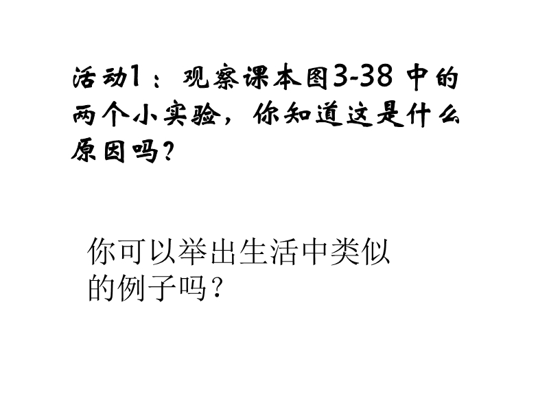 1、将玻璃杯装满水,仍用硬纸片盖往玻璃杯口,用手按住,并倒置过来,放手后看到什么现象?再慢慢按下图1把杯口向各个方向转一圈,又看什么现象?思考:现象的原因是什么?