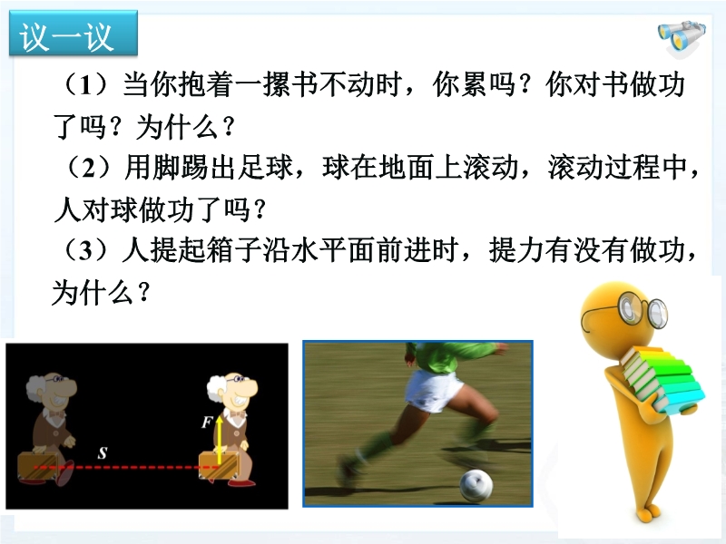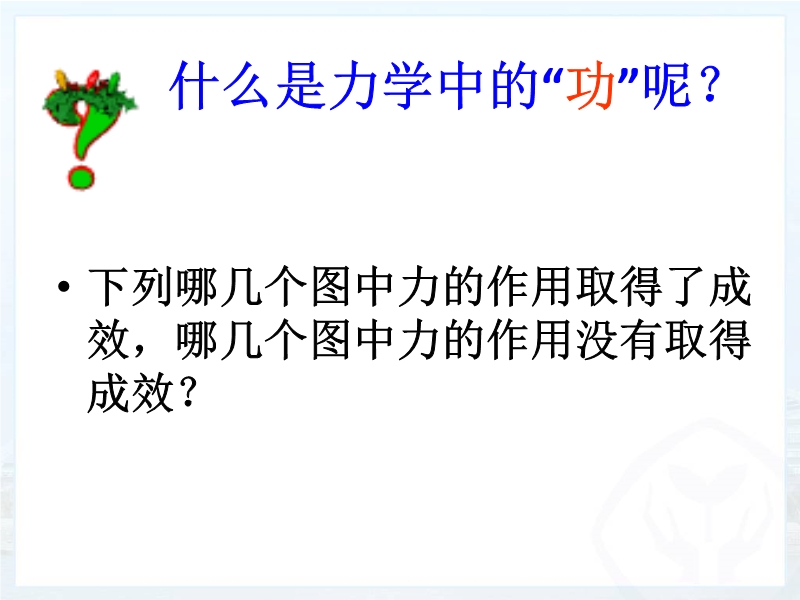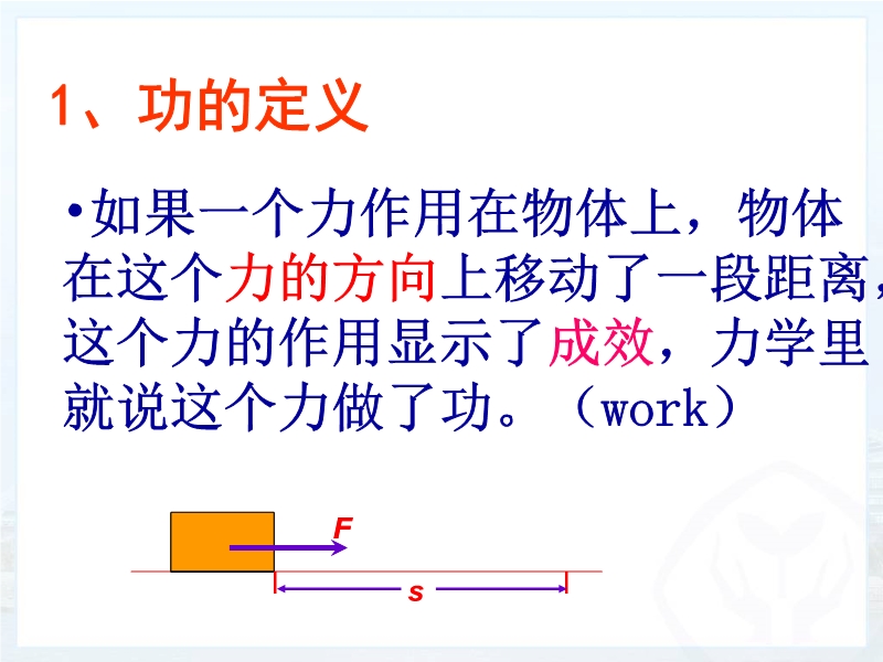 1、 知道力学中做功的含义。能说出做功包含的两个必要因素,并能判断出力是否对物体做功。