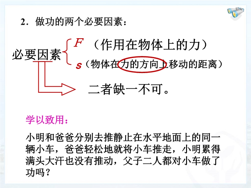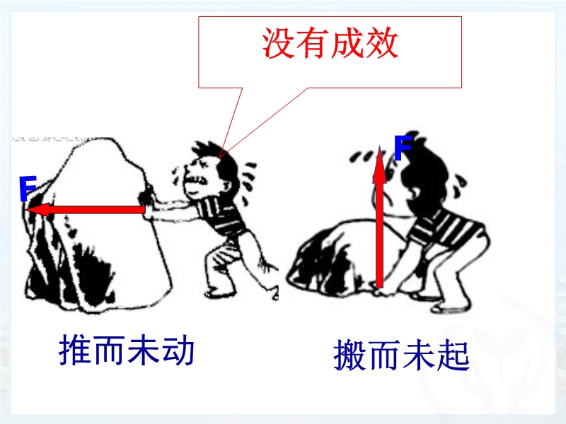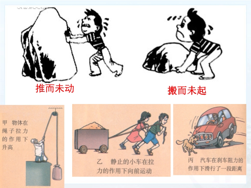 通过各个实例可知力学里功的两个必要因素缺一不可,必须同时具备,力才做功。