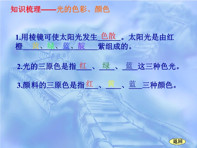 【内容简介】本课件内容主要包括光的颜色、光的传播、光的反射及平面镜等,可供复习光现象时参考使用,共有24张幻灯片。教学过程分为两个模拟:知识梳理和知识应用。帮助学生系统地整理了这部分知识,综合性较强,精选了大量习题,可提高学生的技能。