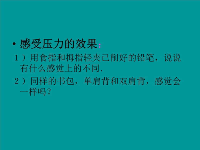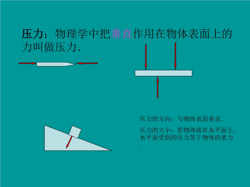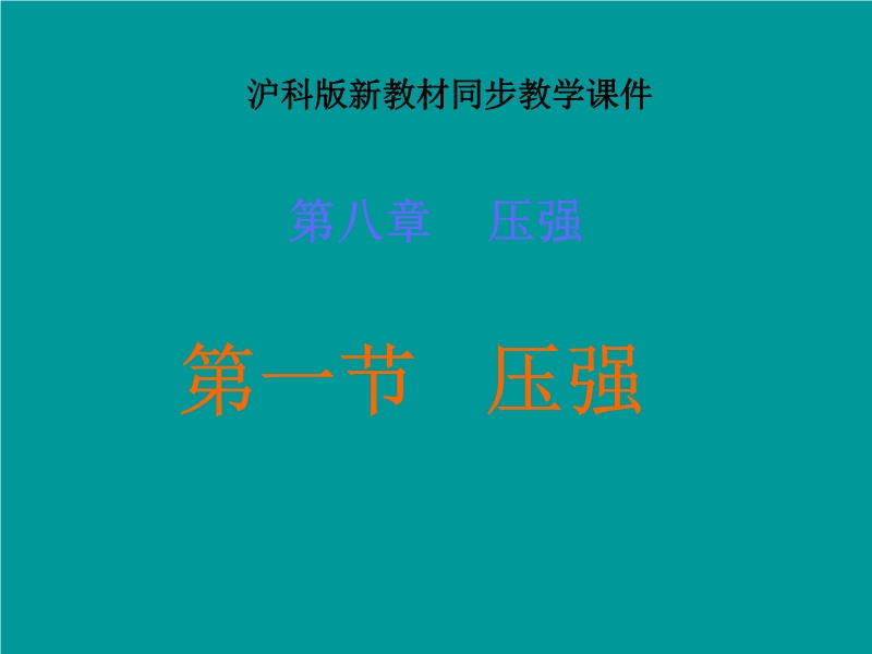 【内容简介】本课件以沪科版新教材第八章第一节为基础制作,共有11张幻灯片,课件制作简洁、生动。首先让学生回顾日常生活中的体验来感受压强的存在,在此基础上进一步引导学生认识了压力的概念,并且引导学生通过简单的实验探究了影响压力作用效果的因素,进一步引入了压强的概念、计算和单位等,课件中还精选了例题,有详细的解答过程。