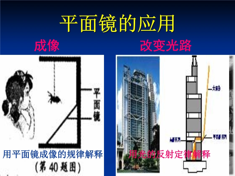 【内容简介】本课件是教科版第四章第三节《平面镜成像》第二课时,采用ppt制作,共12张幻灯片,内容包括平面镜的应用、光污染及倒影的分析,最后有涉及本部分内容的练习题。