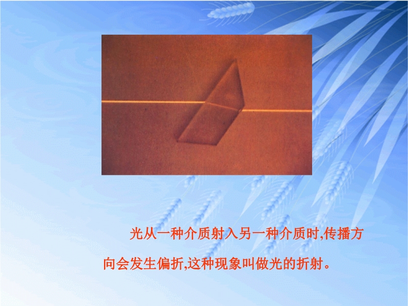 【内容简介】本课件以苏科版新教材第四章第一节为基础制作,共有19张幻灯片,并插入了一个flash动画。课件引导学生探究了光的折射现象,重点引导学生探究了光的折射规律,课件中插入的flash动画具有很好的交互性,学生通过操作可以实现模拟实验,效果较好,现象明显。课件还展示了由于光的折射引起的一些现象,培养学生的应用能力和分析能力。