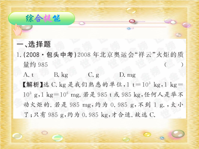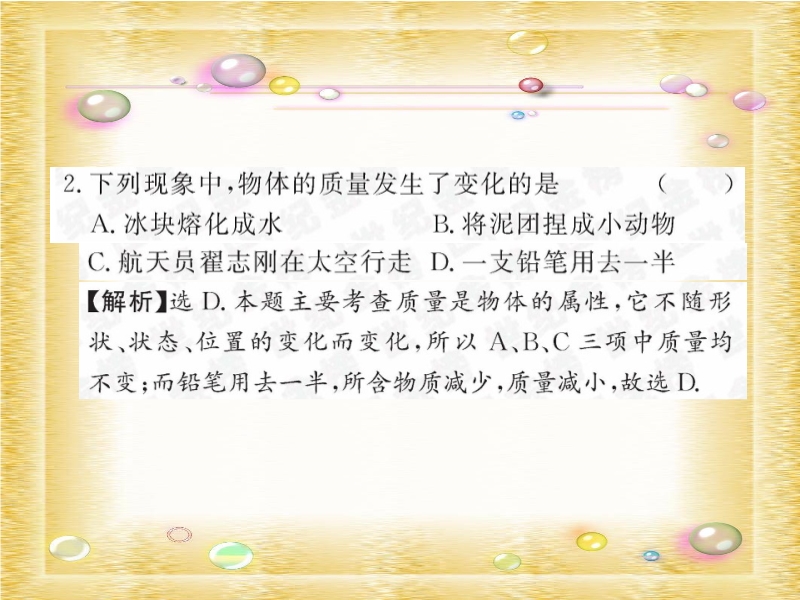 【内容简介】本课件精选了有关质量的典型例题和习题 ,并有详细的解析和答案,有选择题、填空题、实验探究题等,又将题型分为综合提能、方法探究、知识链接、诱思探究等,能提高学生分析问题、解决问题的能力,能激发学生积极进行思考,培养学生的思考能力和思考习惯。
