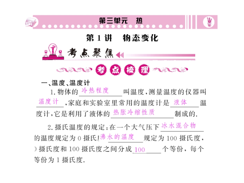 【内容简介】课件根据新人教版教材制作,课件共30张幻灯片,课件采用了2009大量的中考试题为背景,引导学生对《物态变化》知识的归纳和复习。