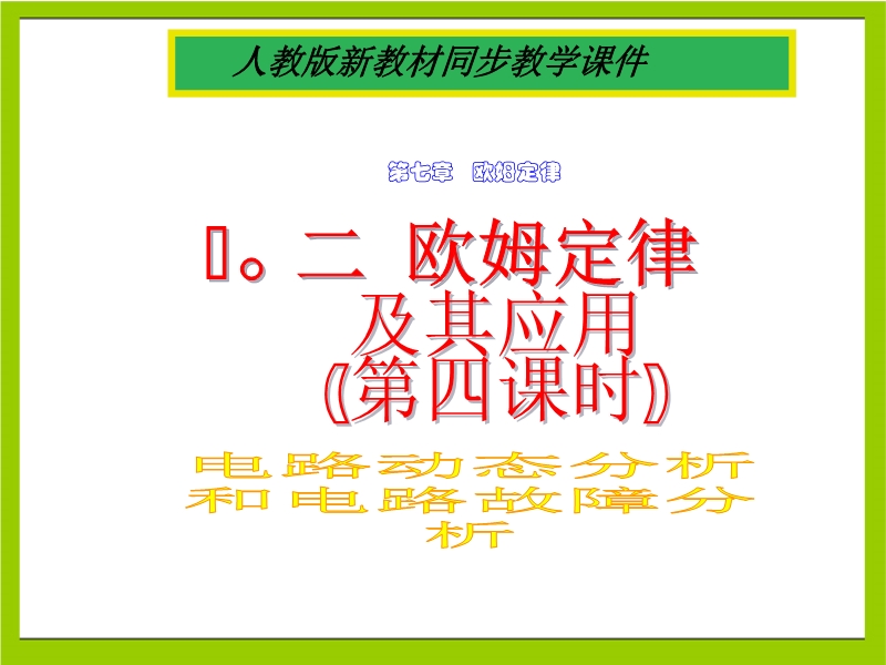 【内容简介】本课件以人教版新教材第七章第二节为基础制作,共有19张幻灯片,主要是欧姆定律的应用。本课件主要引导学生应用欧姆定律分析动态电路和电路的故障问题,教学分为三个模块:滑动变阻器对电路的改变、开关的断开或闭合对电路的影响、电路的故障引起的电路的变化及故障原因分析等。精选了9道例题,并有相应的变式练习。