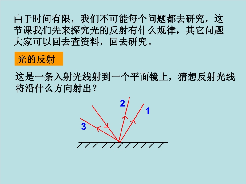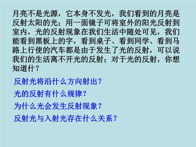 【内容简介】本课件以人教版第四章第二和第三节为基础制作,共有41张幻灯片和多个动画。课件第一部分引导学生认识了光的反射现象,探究了光的反射规律、总结了光的反射定律,认识了光路是可逆的,同时用flash动画向学生展示了两种反射,课件第二部分引导学生设计实验探究了平面镜成像的规律,能充分发挥学生的主动性,培养学生探究能力。在实验的基础上,引导学生总结了平面镜成像的特点,并且引导学生分析这个特点在生活中、科技上的重要应用等。