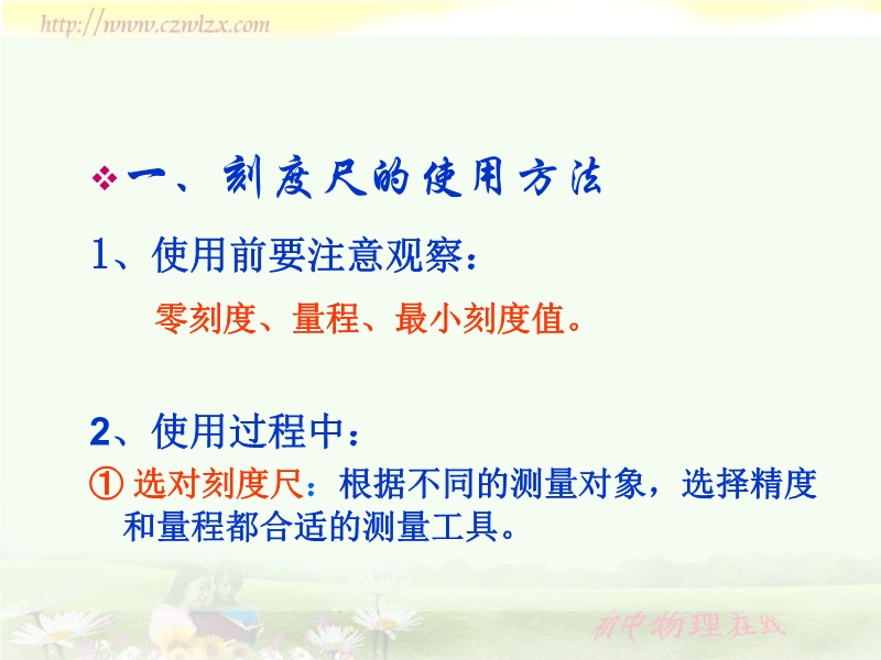 【内容简介】本课件以人教版新教材为基础制作,共有18张幻灯片,并插入了3个动画文件,课件主要引导学生学习了时间的单位及时间的测量、长度的单位及长度的测量等。为了让学生更好地理解刻度尺的使用,课件引用初中物理在线网站“刻度尺测量物体的长度”flash动画,并引导学生探讨了几种特殊测量常用的测量方法,同时用动画进行力生动、形象的模拟。