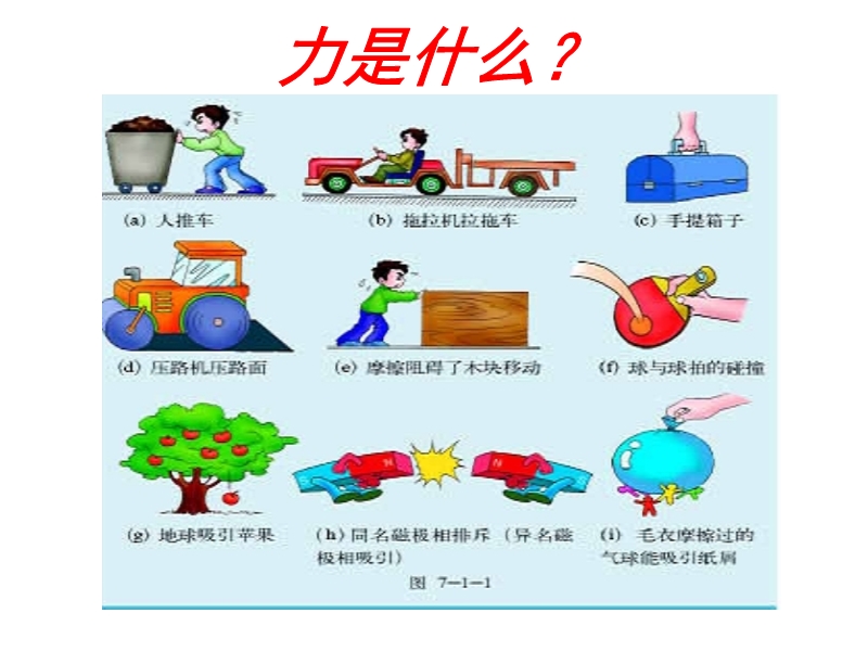 【内容简介】本课件以新人教版新教材第七章第一节《7.1力》为基础制作,共有34张幻灯片,课件在大量事实的基础上,引导学生认识了力的基本概念,讨论了力的作用效果,并通过实验探究了力的作用效果与哪些因素有关,能引导学生从力的三要素来认识力,引导学生学习了如何用力的示意图来表示力。