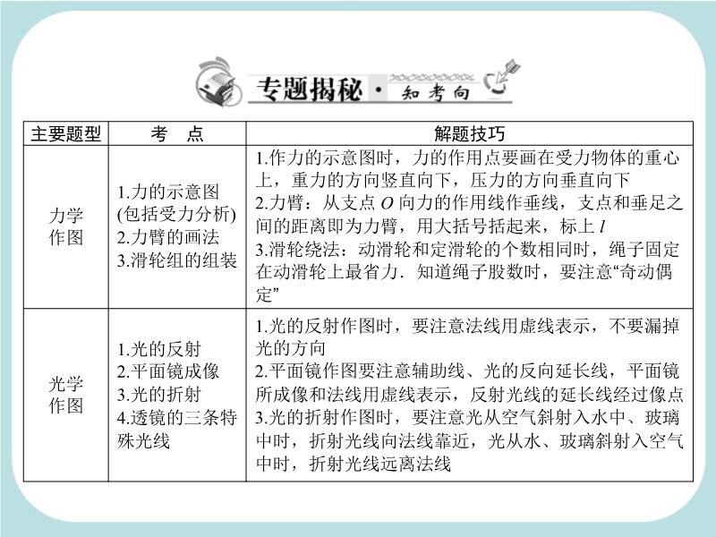 【内容简介】2013届二轮复习课件,课件共158张幻灯片,课件从如下几个专题组织学生复习:1,.作图题,2.实验专题。3.计算专题和4综合能力题,课件精选了大量2012年中考试题供教学参考使用。