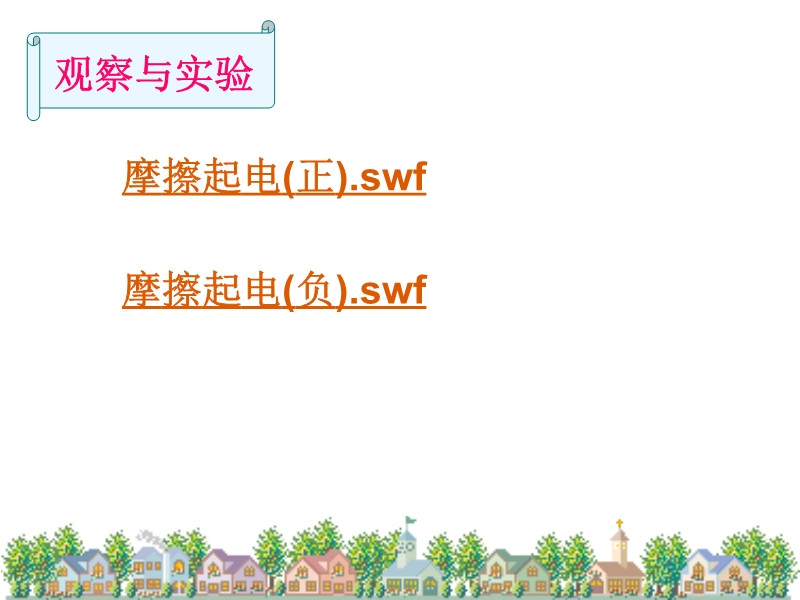 【内容简介】教科版《3.1电现象》ppt+flash课件,本课件以本课件以教科版九年级新教材第三章第一节为基础制作,共有18张幻灯片,并插入了4个flash动画。课件引导学生通过动画模拟了摩擦起电现象,展示了生活中的一些摩擦起电现象,认识了原子的组成,引导学生认识了两种电荷,并用flash动画展示了两种电荷的相互作用,展示了验电器的基本构造、原理、使用方法,分析了摩擦起电的实质等。