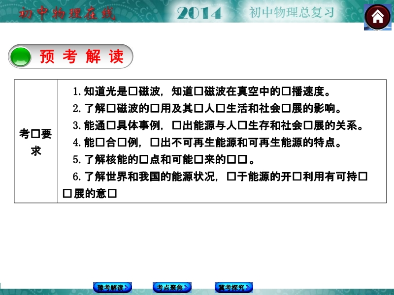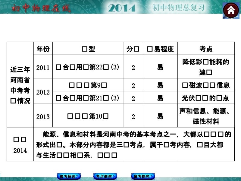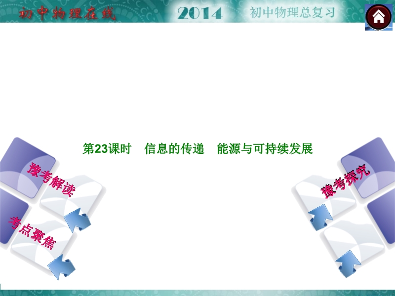 【内容简介】2014中考复习方案课件(河南专版):第23课时 信息的传递 能源与可持续发展,课件共有29张幻灯片。课件分三个板块:第一板块《预考解读》引导学生解读中考考纲,目前中考考什么,分析了近三年河南省中考题型、分值、难易程度和考点等,同时预测2014命题方向。第二板块《考点聚焦》复习了如下考点:信息的传递、能源与可持续发展,组织学生,进一步熟悉教材、重视双基的落实。课件的第三板块《豫考探究》,按考点分成几大类型,以2013中考试题为抓手组织学生复习,最后展望了中考试题的命题角度。课件设计合理科学,供2014年中考首轮复习参考使用。