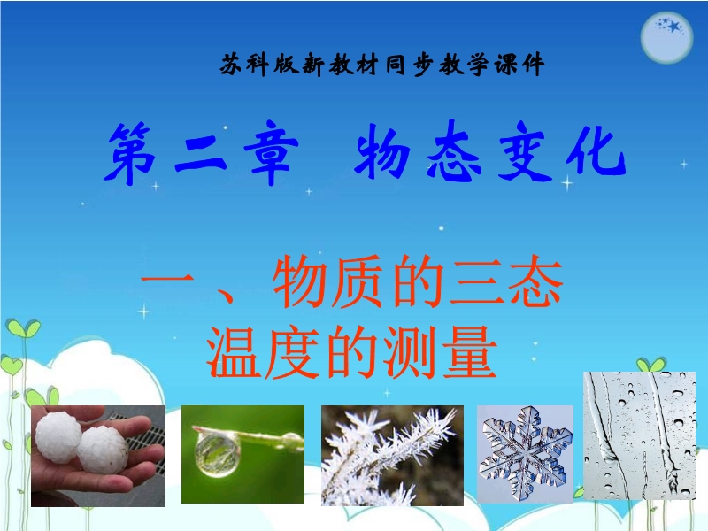 【内容简介】苏科版:《2.1物质的三态 温度的测量》ppt课件,共有59张幻灯片和内嵌1个flash课件。课件首先展示了自然界中的一些自然现象如:水的物质形态,让学生认识了水存在的三种状态。课件认识温度及其测量工具-温度计,重点引导学生认识和学习了液体温度计的原理及使用方法等。