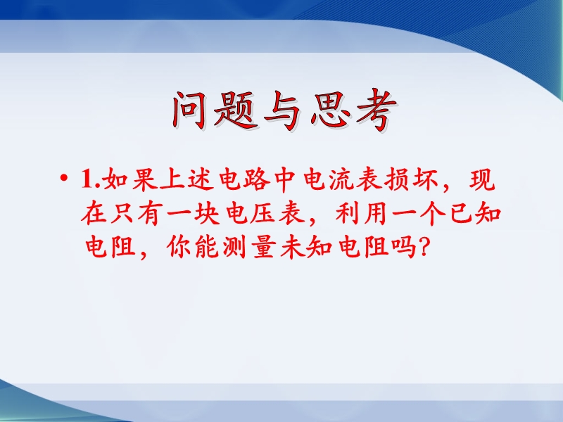 【内容简介】北师大版:《12.4欧姆定律的应用》PPT课件,共有11张幻灯片。课件引导学生讨论了电路中电流表缺失,现在只有一块电压表或电流表,利用一个已知电阻,你能测量未知电阻,教学设计充分体现学生的自主学习,能激发学生的学习兴趣。