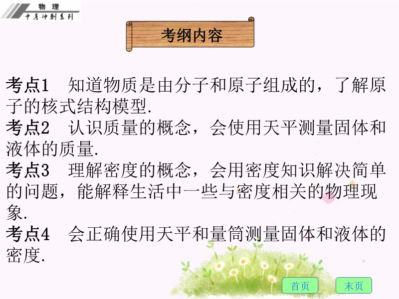 【内容简介】【中考冲刺】人教版2016年初中物理中考复习课件 《 第六章 质量与密度》ppt课件,课件共有61张幻灯片,课件设计了考纲内容;考情分析;考点梳理;剖析重点实验;重难点突破;课堂精炼等栏目,考纲内容引导学生认识了本章的主要考点,通过考情分析分析近几年来中考命题的形式,考点梳理主要引导学生复习教材基础知识内容,剖析重点实验通过引用2015年中考试题,通过变式训练突破“托盘天平的使用、对密度概念的正确理解”等难点,最后精选试题提高能力!