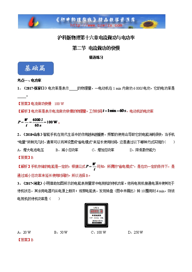 【内容简介】【全品新教案】16-17年九年级物理上册备课资源包:16.2电流做功的快慢(沪科版,含教案、课件、学案、课时训练)