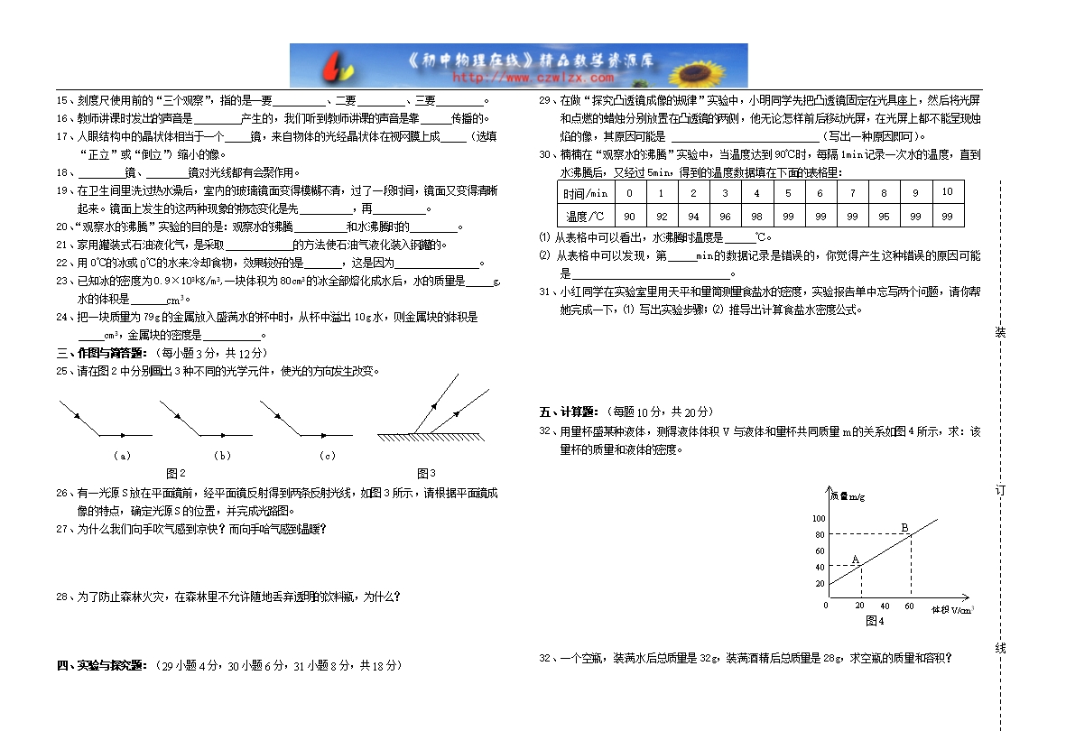 6、若入射光线与法线的夹角为30°,则反射角为 ,若入射角增大20°,反射角将增大 。若入射光线垂直射入水中,传播方向将 。