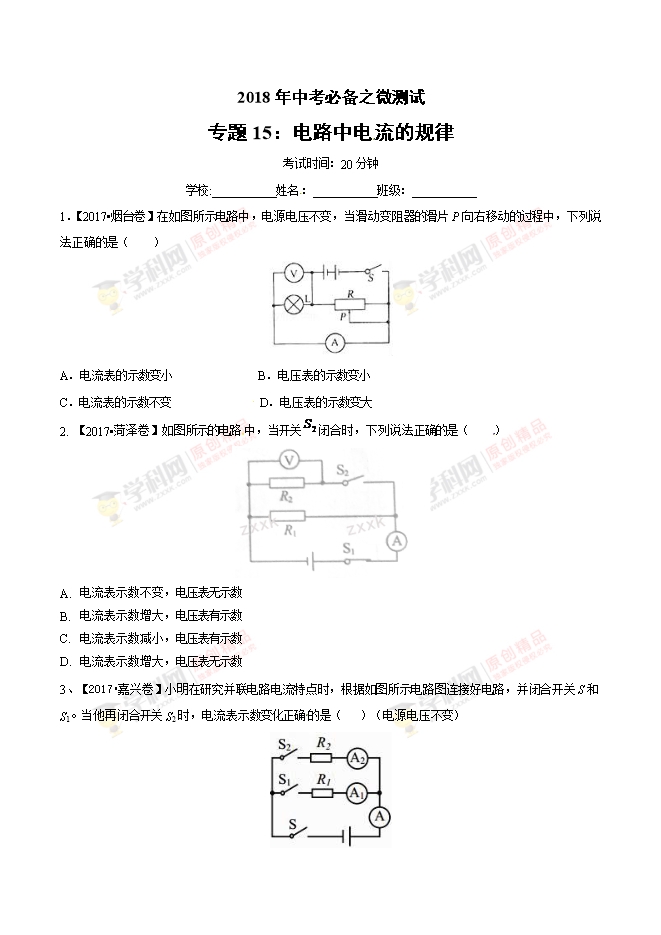4. 【2017•枣庄卷】如图所示,电源电压恒为5V,电压表的量程为“0~3V”,电流表的量程为“0~0.6A”,滑动变阻器的规格为“20Ω 1A”,灯泡标有“3V 1.8W”字样。闭合开关,在电路安全的情况下(不考虑灯丝电阻的变化),则下列说法中正确的是( )