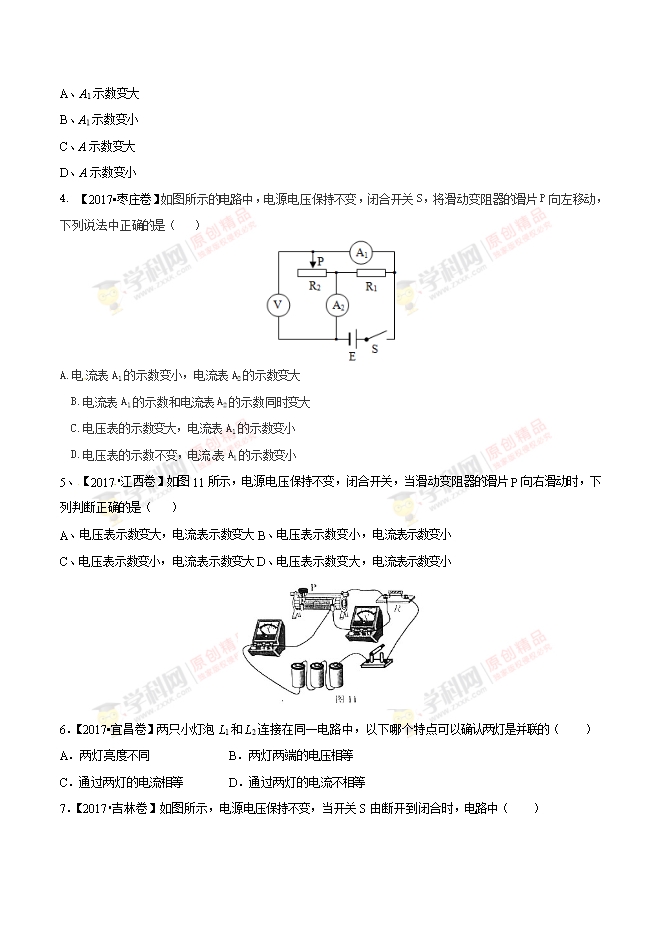 2. 【2017•安徽卷】如图所示,滑动变阻器的滑片P处于中间位置,闭合开关S,两个灯泡均能发光(假设灯丝电阻不变),此时,将滑动变阻器的滑片P向右移动,则[来源:学|科|网]