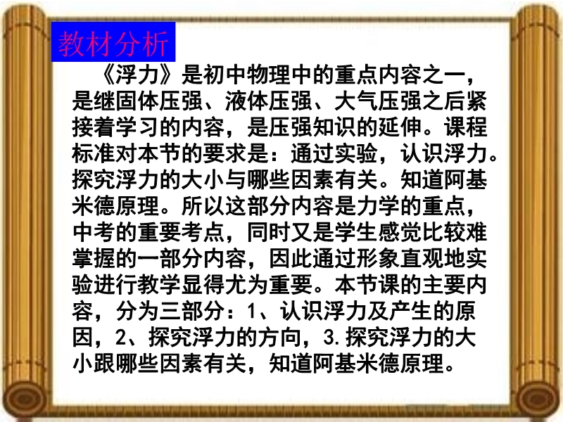 【内容简介】人教版说课:《浮力》PPT说课+视频,课件是一个说课课件,重点突出实验创新方面的设计,提供了创新视频四份。