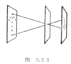 将物屏、小孔屏和毛玻璃屏按图2.2-3所示摆好,使它们的中心大致在一条直线上。依次点亮物屏上的小灯泡,如从箭头尾部的灯泡开始,可以看到,在毛玻璃屏上依次出现一个个小的圆形光斑,直到屏上显示出由圆形光斑组成的与物相似的图案。这个实验可以很直观地看到物点和像点的一一对应关系。实验所用的小孔孔径可取大一些,以增大像的亮度。