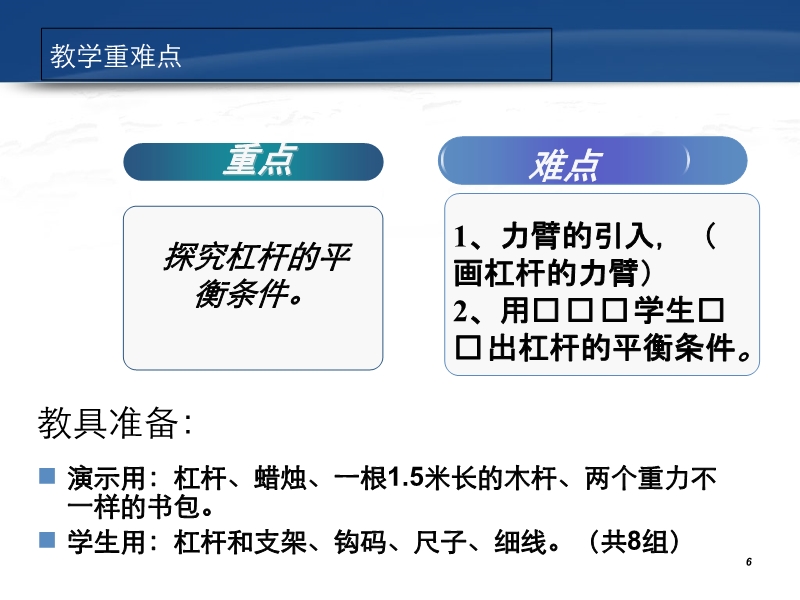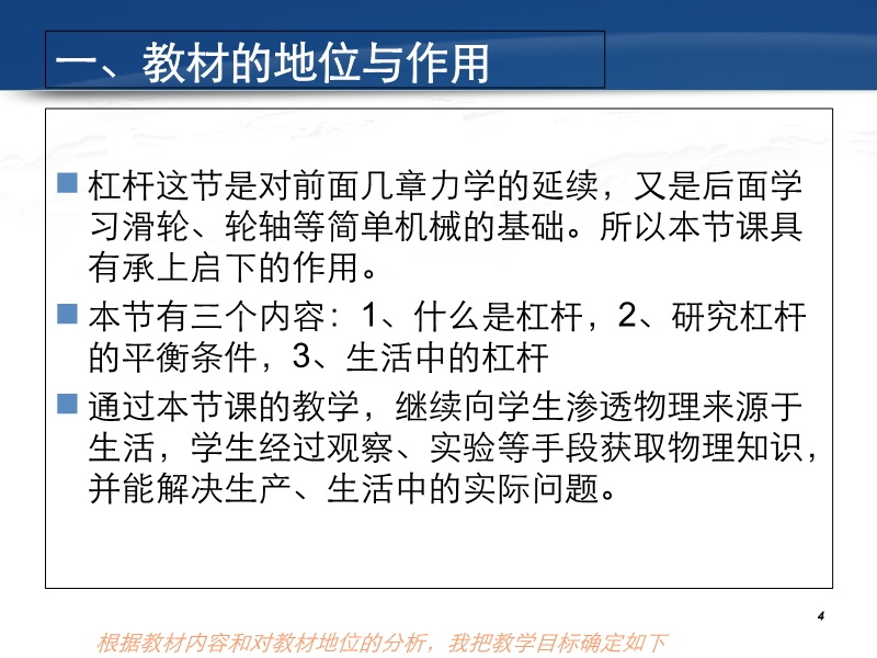 【内容简介】人教版说课课件:《12.1杠杆》PPT,共有22张幻灯片,课件主要讲述了本节教材内容要点、教材的地位和作用、教学目标、教学的重点与难点、教学方法及学法等