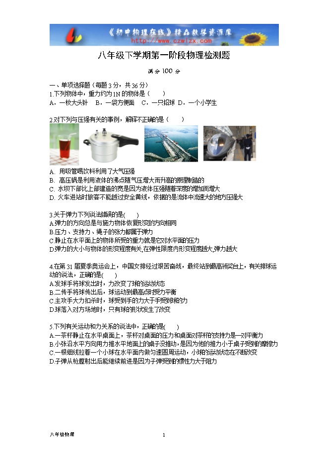 湖北省随州市2017-2018学年第一阶段考试八年级下册物理期中试题(无答案)