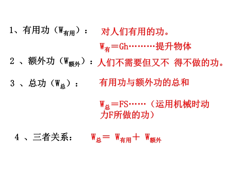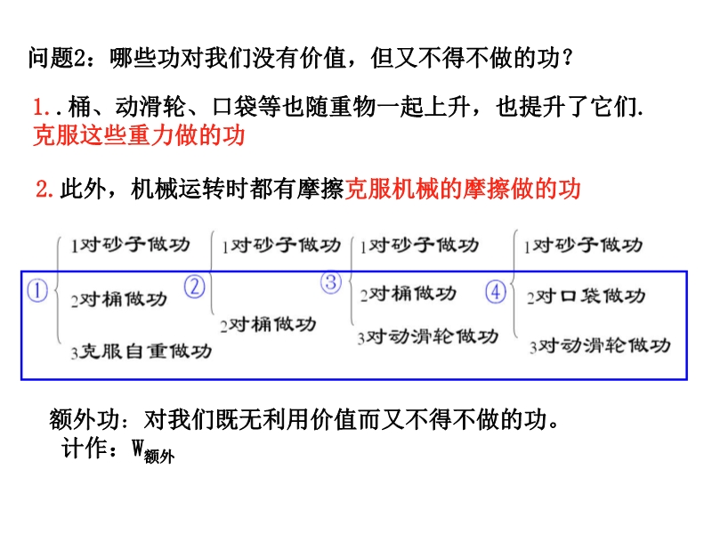 【内容简介】2018年人教版:《12.3机械效率》PPT课件,共有30张幻灯片。课件从提出问题开始引导学生进入学习,让学生从具体的实例中认识了什么是有用功、什么是额外功、什么是总功,并总结了它们的关系,在此基础上,引导学生认识了机械效率的概念及意义,课件中有例题和习题。