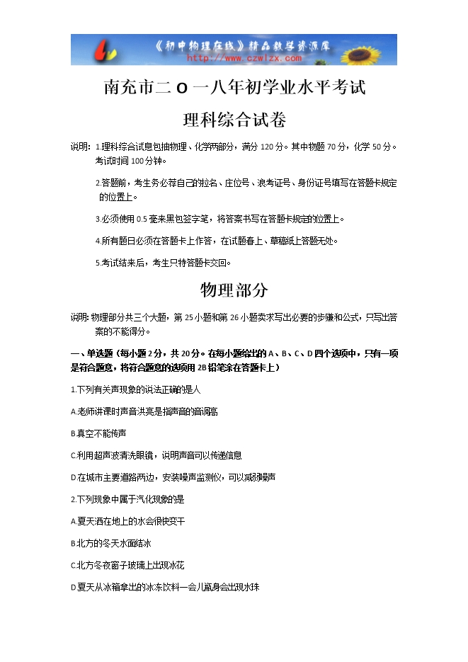 说明:1.理科综合试息包抽物理、化学两部分,满分120分。其中物题70分,化学50分。考试时间100分钟。